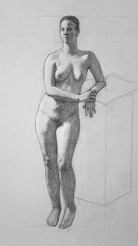 What often separates good and great art can be the observation of the light effect. Think of a light source from above and how it would affect your subject. The light areas at the top of the subject would be brightest and they would gradually get darker the further they are from the light. If you draw a standing figure with a light from above and the arms and legs catching the light are the same tone, then the legs would have to be darkened to achieve the light effect. Having a dark background to frame the lights can help this effect.